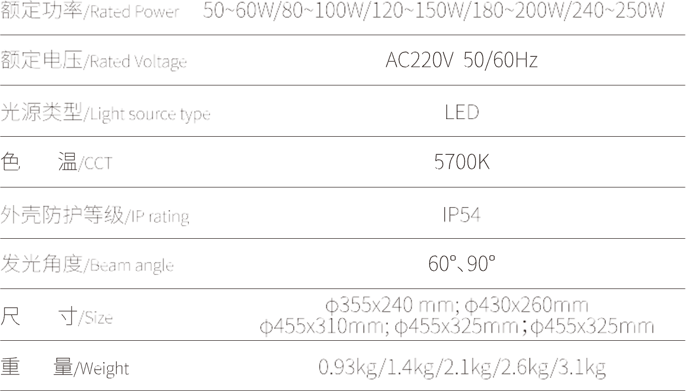 采用纯铝反光罩,防眩设计,将光均匀反射,提高灯具的发光效率,标配吊环,安装简单,拆卸方便